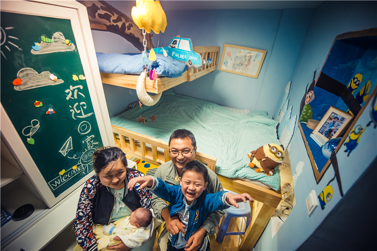 仅5平方米的空间内,容纳下了多功能台、双层床,甚至还在床下搭起了儿童游乐空间,墙上手绘的小黄人、长颈鹿和天花板上的星空图……这个集美观、舒适、实用于一体的居住空间,不仅能基本满足一个家庭的日常生活,还处处透着甜甜的温暖。