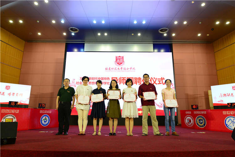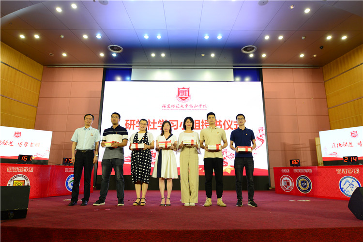比赛结束后,还举行了福建师范大学协和学院习近平新时代中国特色社会主义思想师生研学社(以下简称“研学社”)导师聘任仪式和授书仪式。院党委常务副书记黄俊兴为王郑冰、李莉、李秋烟、刘田甜、李媛媛等5位老师颁发聘书。院党委副书记陈晓斌为研学社师生代表赠送了《习近平谈治国理政》、《习近平新时代30讲》、《习近平的七年知青岁月》、《习近平用典》、《习近平讲故事》等在内的学习书籍。