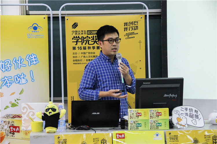 在命题宣讲环节中,碧生源、恒源祥等各五大命题企业代表分别为在座学子分析本次学院奖创意命题。TOPic创意合伙人吴文星围绕“有温度的创意”和“和创意谈恋爱”两个主题分享了他作为一名广告人的经历。