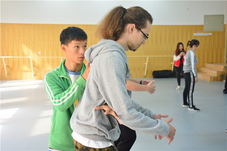 白俄罗斯学子在体验“化柔为刚”的武术动作 李燕萍/摄