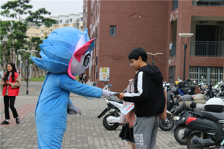 学院团委吉祥物“团团”向过往的同学们发放宣传单页