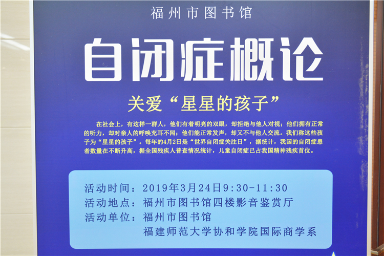 3月24日上午,一场针对自闭症发现与预防的主题讲座在福州市图书馆新媒体鉴赏室展开。协和学院国际商学系2018级会展第1团支部的青年志愿者与现场的自闭症儿童家长等60余人共同聆听了讲座。