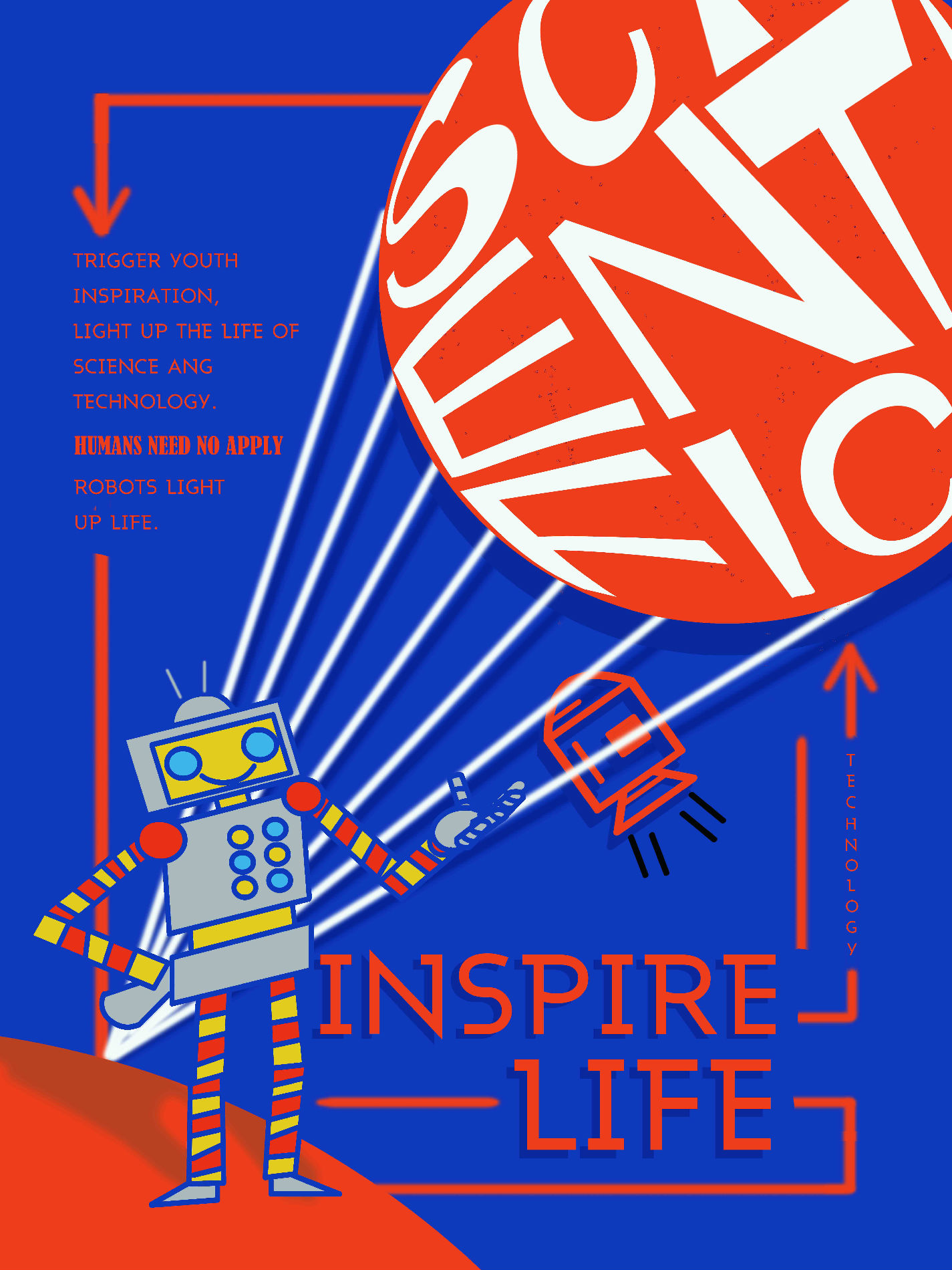 我制作的海报灵感来自阿西莫夫的《我,机器人》,随着社会的飞速发展,科学不断进步,人工智能时代势不可挡,尤其是机器人将在人类生活中得到更广泛的应用,给人类的生活带来便利。海报选用了机器人、地球、火箭、文字、线条为主要设计元素衬托海报主题,其中线条和框架线增添了海报的设计感。主要配色为蓝色和橙色,蓝色象征着科技感,橙色代表青春活力,以及对未来人工智能时代的展望。机器人的笑脸对人工智能的期待,机器人胸口的三行按钮表达对机器人三大定律的暗喻。地球上的“scientific”象征在未来地球将会迎来人工智能时代,高科技将会逐渐点亮人类生活。