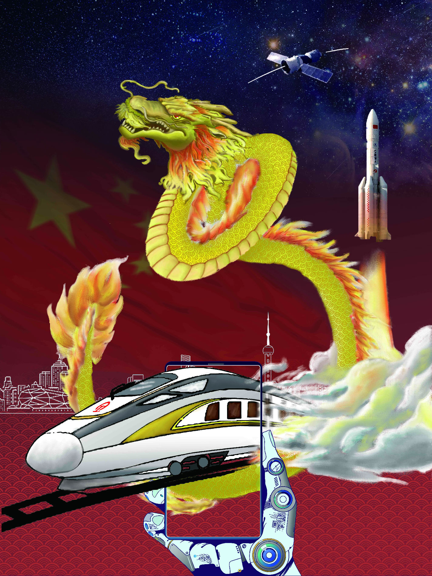 关于画布背景:建国70周年,因为是周年,所以我觉得应该要严肃一点,因此选择了偏暗的红色,显得稳重。还加入云纹进行点缀。云纹在古代中国是吉祥图案,象征高升和如意。祝福祖国繁荣昌盛,有美好的祝愿在里头。加入中国龙形象:有多重含义:1.龙,是中国传说中的神异动物,中国人也自称为“龙的传人”。用龙来代表中国;2.龙的形态,是由数字“70”和中国行楷书法的“飞”字结合而成。70,代表中华人民共和国成立70周年。而行楷的“飞”字,一方面,表示着中国强大的文化内核;另一方面,表达了对祖国科技飞跃的喜悦及对祖国未来雄伟腾飞的美好祝愿。龙头设计成微微抬起,龙抬头,也比喻前进、奋发向上。加入长征系列火箭、墨子号、复兴号高铁:展示建国70周年以来国家自主研发的重大科技成果。特地选择速度快的科技产品,也比喻飞速发展的科技水平。