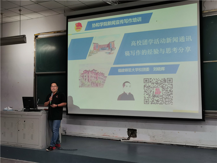 10月10日下午,“校园新闻写作规范与技巧”专题培训讲座在福建师范大学协和学院河西C1阶梯教室开讲。福建师范大学团委宣传部部长刘晓晖老师受邀主讲,200多名学生记者共同聆听讲座。