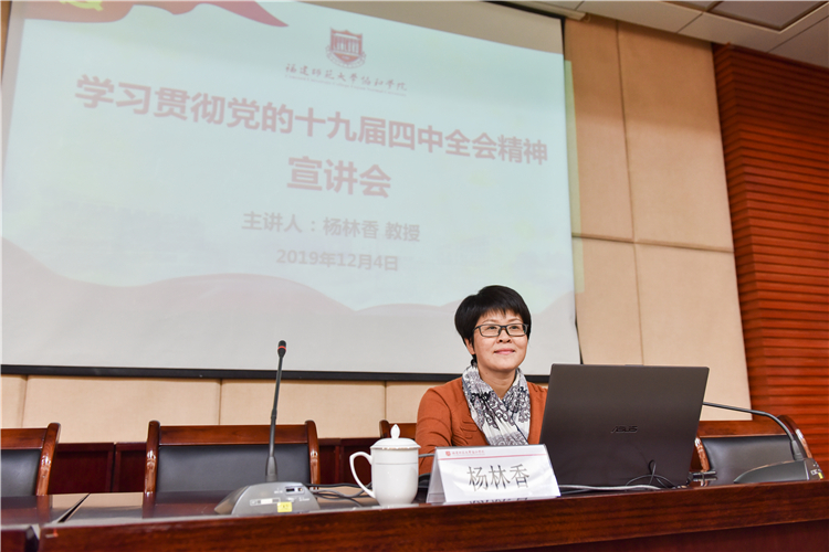 12月4日下午,福建师范大学协和学院在学术报告厅举行党的十九届四中全会精神学习会,福建师范大学党委讲师团成员、副院长杨林香教授为学院师生作《坚持和完善中国特色社会主义制度与国家治理体系》的专题宣讲。学院领导,副主管以上管理职员,全体教职工党员、学生党员和发展对象参加了学习。宣讲会由院党委副书记、纪委书记陈晓斌主持。