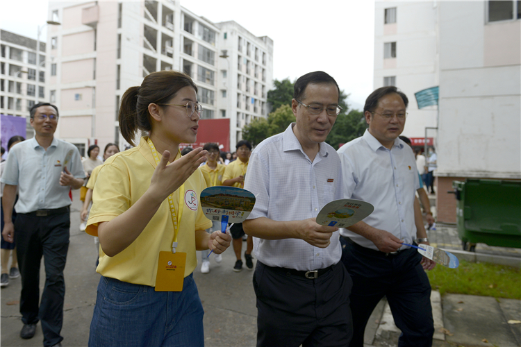 “李书记、王校长,这是我们推出的黄衫军‘新生入学礼’,有厉行节约的主题扇子和挂钩贴。”院学生记者站站长吴芳怡同学向迎新主题活动,“院学生记者站是我们协和学院第一批成立党支部的社团,我们既努力采写新闻担当校园媒体言说的责任,又积极参与大学生思想引领。这次的活动就是积极贯彻落实习近平总书记对制止餐饮浪费行为作出的重要指示精神。”“黄衫军,很有名!”李书记肯定道:“你们用扇子在新生宣传厉行节约很有意义。”