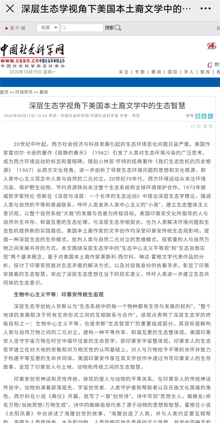 10月19日,《中国社会科学报》刊发陈征老师理论文章《深层生态学视角下美国本土裔文学中的生态智慧》。