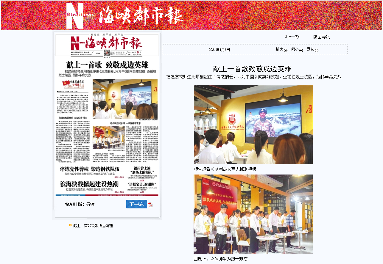 4月6日出版的《海峡都市报》头版以近整版的篇幅图文报道了,福建师范大学协和学院以原创歌曲、烈士陵园祭扫等形式缅怀先烈。