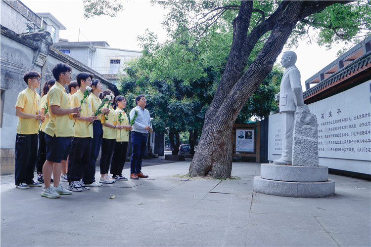 “吴石将军是我党打入国民党内部级别最高的情报官,为加速解放战争的胜利做出了特殊的贡献。”院学生记者站成员颜至加化身青年讲解员,讲述吴石将军打入敌人内部,在周旋中获取高层情报的生平事迹。在吴石塑像前,全体师生怀着崇高的敬意献上花束,肃然敬礼,并面对鲜红的党旗重温入党誓词。