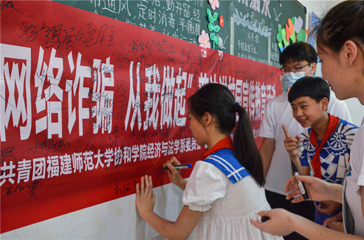 5月26日下午,福建师范大学协和学院经济与法学系团委联合共青团晋安区委员会、晋安区北极星青少年事务社工中心在福州市象园小学开展“防范电信网络诈骗,从我做起”普法宣传教育活动。