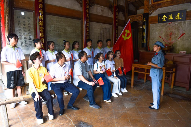 少共国际师指挥部旧址在洪田镇马洪村廖家祠堂——逢源堂内。1934年8月,红一军团少共国际师曾在此驻扎,并作为临时指挥部,指挥参与小陶战役,留下了200多条红军标语。“只有苏维埃才能救中国”“白军士兵要求北上抗日去”“反对国民党出卖华北”……在讲解员的带领下,实践队通过直观感受红色教育基地所蕴含的革命历史,更深刻地认知中国共产党艰苦的发展历程,领悟坚韧不拔的革命精神和为革命事业奋不顾身的崇高献身精神。