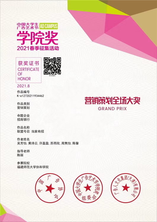 日前,由中国广告协会主办的中国大学生广告艺术节学院奖2021春季创意盛典成功举行。福建师范大学协和学院文化产业系选送的作品《联盟号召,当家有招》从全国高校20余万组作品中脱颖而出,斩获营销策划类唯一的最高奖项——营销策划全场大奖,获得奖金3万元。该奖项是学院奖从众多策划作品中选出的综合实力最强、表现最出色、认可度最高、最能代表学院奖策划作品顶级水平的最高荣誉。