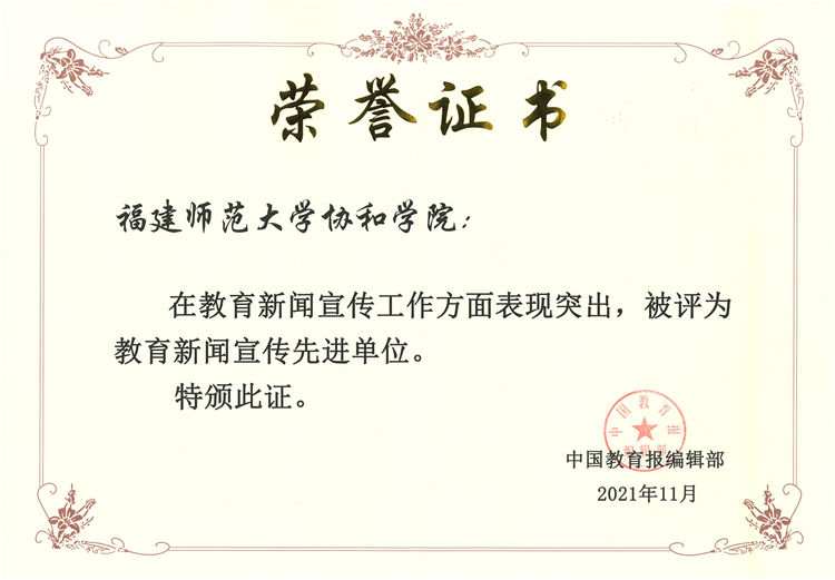 近日,福建师范大学协和学院荣获由中国教育报授予的“教育新闻宣传先进单位”荣誉称号,院党委党务工作部新闻宣传中心林响、刘宝飞2位老师被评为“教育新闻宣传先进个人”。