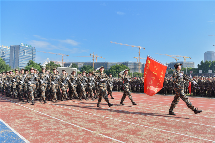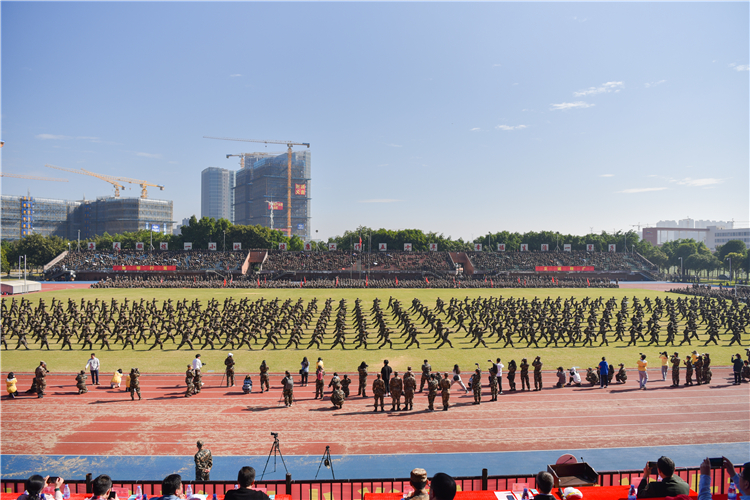 在庄严的国歌声中,学院八一学社国旗护卫队员将五星红旗冉冉升起,拉开了总会操的序幕。2021级全体参训学员组成20余个方阵,正步踏入东区田径场,向大家展示十二天的训练成果。