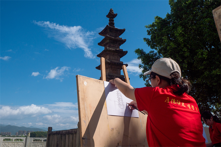 院暑期社会实践团队成员正在绘制镇国宝塔 陈一鸣/摄