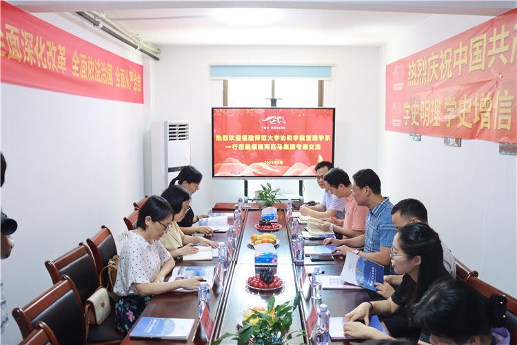 6月20日上午,福建师范大学协和学院管理学系前往福建两匹马集团有限公司开展访企拓岗活动,管理学系党总支书记苏秋红、系主任雷金英、教工党支部副书记吴琳以及毕业班辅导员一同前往,并与福建两匹马集团总裁冯海涛,副总裁江城及管理学系校友进行座谈交流。