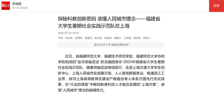 7月23日,新福建报道由福建师范大学、福建技术师范学院、福建师范大学协和学院组成的“追寻领袖足迹 担当强国使命”2025年福建省大学生暑期社会实践示范队,循着领袖足迹继续前行,走进上海交通大学学生创新中心、上海人民城市实践展示馆、人人屋党群服务站、杨浦滨江工业带,探寻上海高等教育在建设产教融合育人体系方面先行先试成果,在“行走的课堂”中解码教育科技人才融合发展的“上海方案”,感悟“人民城市”理念的磅礴伟力。