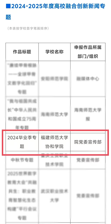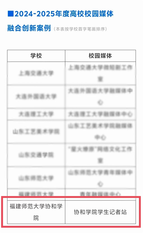 近日,中青校媒“寻找2024-2025年度高校校园媒体融合创新案例”活动圆满落幕。福建师范大学协和学院学生记者站融媒体案例《破局·赋能·反哺:融媒体团队的创新三维构筑》入选“2024-2025年度高校校园媒体融合创新案例”,学院2024毕业季专题入围“2024-2025年度高校融合创新新闻专题”。