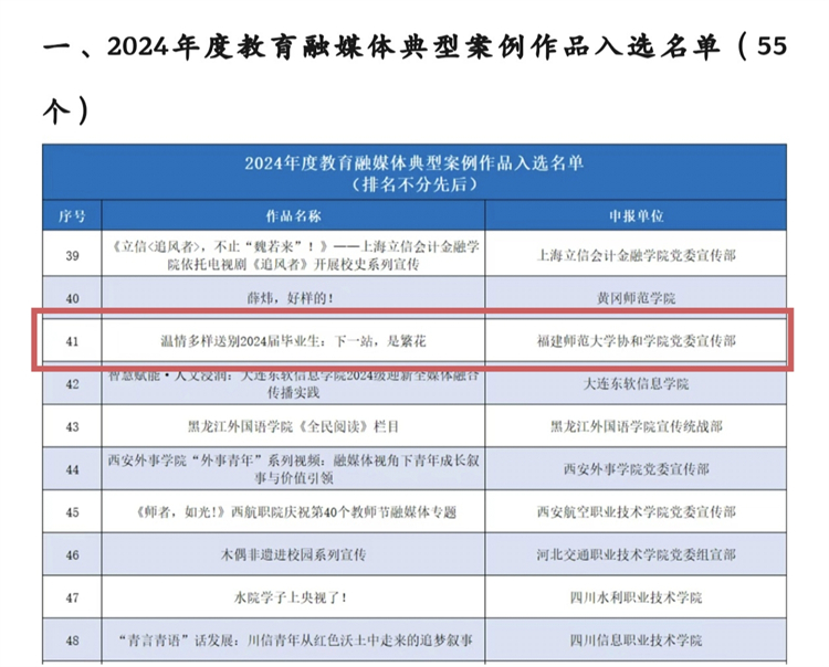 8月20日,2024年度教育融媒体典型案例作品、案例项目入选名单公布。福建师范大学协和学院申报的《温情多样送别2024届毕业生:下一站,是繁花》入选2024年度教育融媒体典型案例作品。