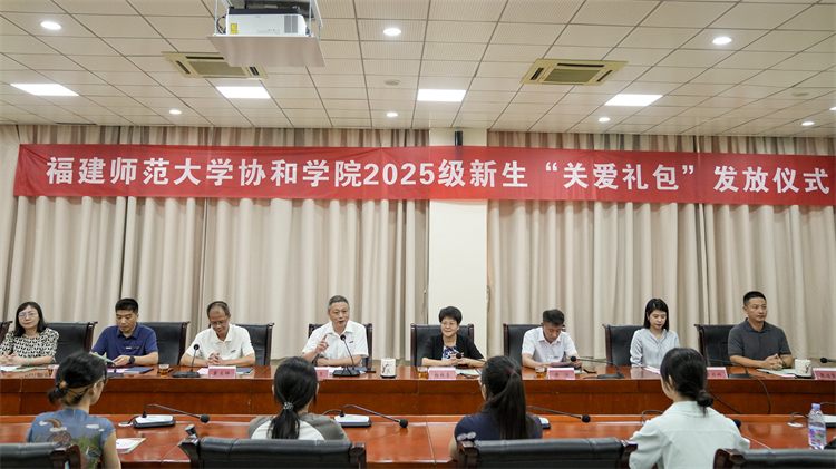 9月7日下午,福建师范大学协和学院2025级新生“关爱礼包”颁发仪式在第六会议室举行,院领导陈林男、杨林香、戴文坤、黄滨、卢宇,学生事务部、教务部、财务部相关工作人员及2025级辅导员、困难新生代表参加。仪式由院党委副书记、纪委书记戴文坤主持。