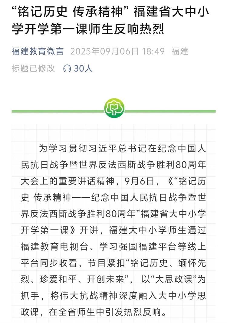 为学习贯彻习近平总书记在纪念中国人民抗日战争暨世界反法西斯战争胜利80周年大会上的重要讲话精神,9月6日,《“铭记历史 传承精神——纪念中国人民抗日战争暨世界反法西斯战争胜利80周年”福建省大中小学开学第一课》开讲,福建大中小学师生通过福建教育电视台、学习强国福建平台等线上平台同步收看,节目紧扣“铭记历史、缅怀先烈、珍爱和平、开创未来”, 以“大思政课”为抓手,将伟大抗战精神深度融入大中小学思政课,在全省师生中引发热烈反响。