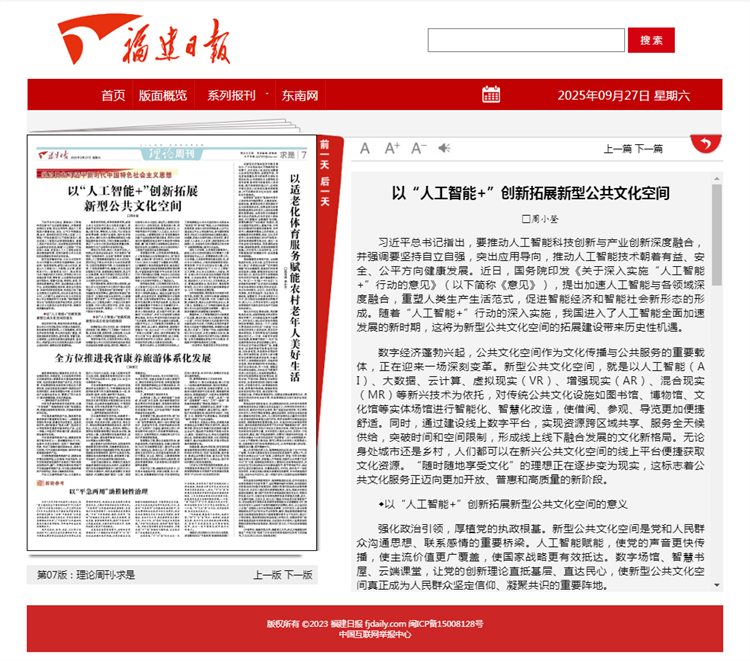9月27日,福建日报第7版刊发福建师范大学协和学院文化产业系教师周小登理论文章《以“人工智能+”创新拓展新型公共文化空间》。