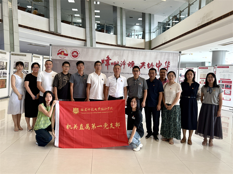 近日,福建师范大学协和学院机关直属第一党支部党员前往福建师范大学旗山校区图书馆主题展厅,参观“烽烟淬魂 共铸中华”——纪念中国人民抗日战争暨世界反法西斯战争胜利80周年和台湾光复80周年主题图片展。