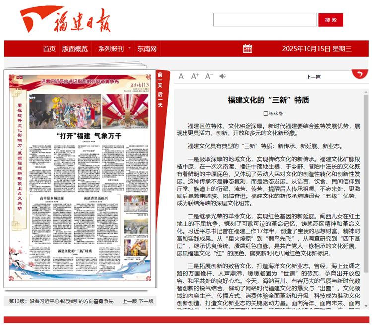 10月15日,福建日报第十三版“沿着习近平总书记指引的方向奋勇争先”专题报道杨林香教授文章《福建文化的“三新”特质》。