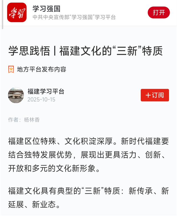 10月15日,学习强国刊发福建师范大学协和学院院长杨林香教授文章《福建文化的“三新”特质》。