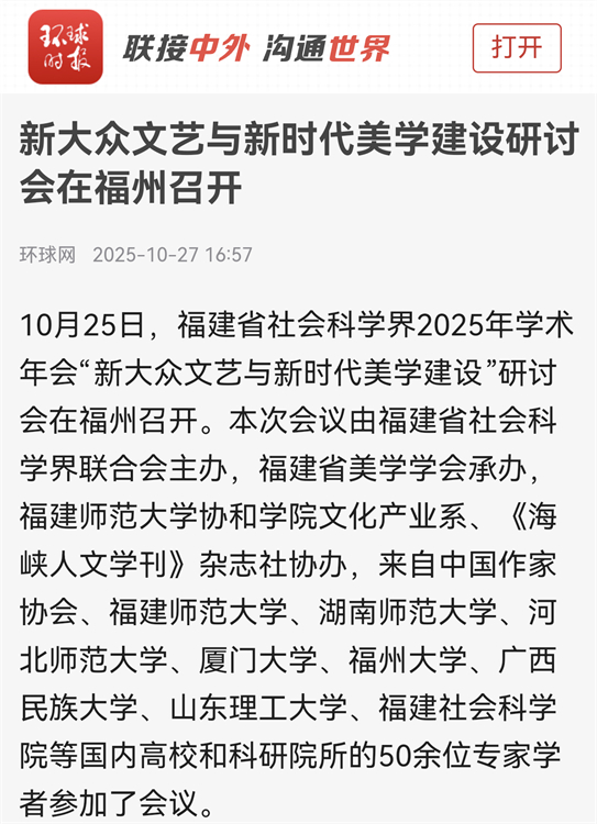 据了解,本次研讨会是福建省社科界2025年学术年会分论坛之一,得到全国学者积极响应,共收到会议论文50余篇。这些论文选题视野开阔,围绕新大众文艺的理论建构与时代审视、文学创作实践与美学传统的诠释、生活美学与媒介转型的多元探索、文化传承与美育实践的当代路径等展开了较为充分的探讨与对话,既勾勒出新时代文艺发展的生动图景,也为美学建设的未来路径提供了多元思考,呈现出理论与实践交织、传统与现代碰撞的鲜明特质。本次会议不仅为学者提供了高质量的学术交流平台,促进了新大众文艺研究领域的观点碰撞与思想深化,而且对促进“闽派”文艺的创新发展、服务新时代新福建文化建设具有重要意义。