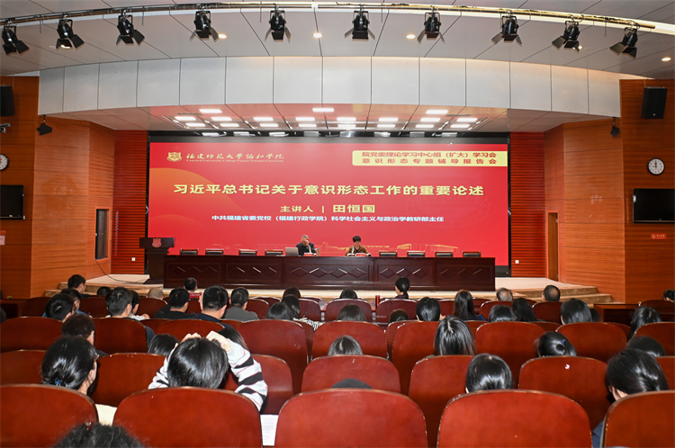 11月5日上午,福建师范大学协和学院在学术报告厅召开院党委理论学习中心组(扩大)学习会,邀请中共福建省委党校(福建行政学院)科学社会主义与政治学教研部主任田恒国教授,作题为“习近平总书记关于意识形态工作的重要论述”的专题辅导报告。院领导、全体中层干部、马克思主义学院全体教师、全体行政教辅人员及思政辅导员参加学习。报告会由院长杨林香主持。