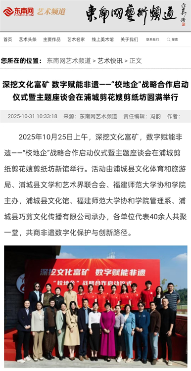 10月31日,东南网报道深挖文化富矿,数字赋能非遗--“校地企”战略合作启动仪式暨主题座谈会在浦城剪纸剪花嫂剪纸坊新馆举行。活动由浦城县文化体育和旅游局、浦城县文学和艺术界联合会、福建师范大学协和学院主办,浦城县文化馆、福建师范大学协和学院管理系、浦城县巧剪文化传播有限公司承办,各单位代表40余人共聚堂,共商非遗数字化保护与创新路径。