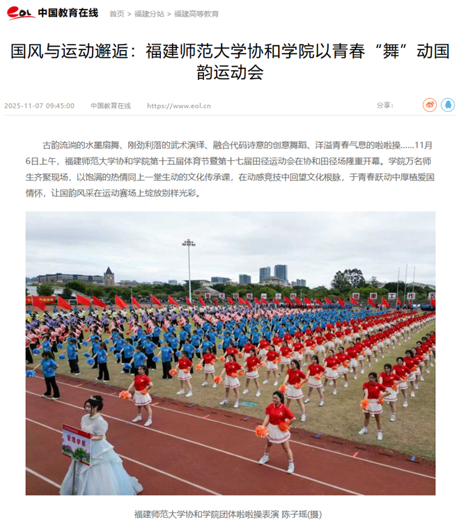 11月7日,中国教育在线报道福建师范大学协和学院第十五届体育节暨第十七届田径运动会在协和田径场隆重开幕。学院万名师生齐聚现场,以饱满的热情同上一堂生动的文化传承课,在动感竞技中回望文化根脉,于青春跃动中厚植爱国情怀,让国韵风采在运动赛场上绽放别样光彩。