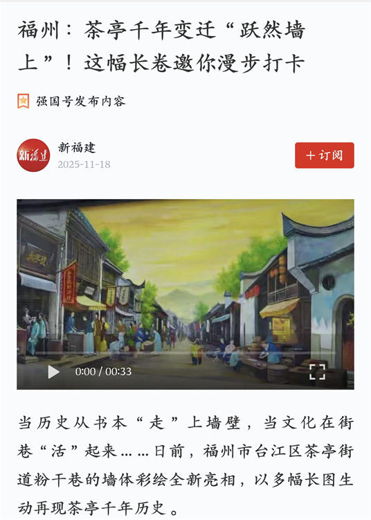 11月18日,学习强国报道福州市台江区茶亭街道粉干巷的墙体彩绘全新亮相,以多幅长图生动再现茶亭千年历史。据悉,该彩绘墙由茶亭街道引进福建师大协和学院壁画团队,历时8个多月完成。