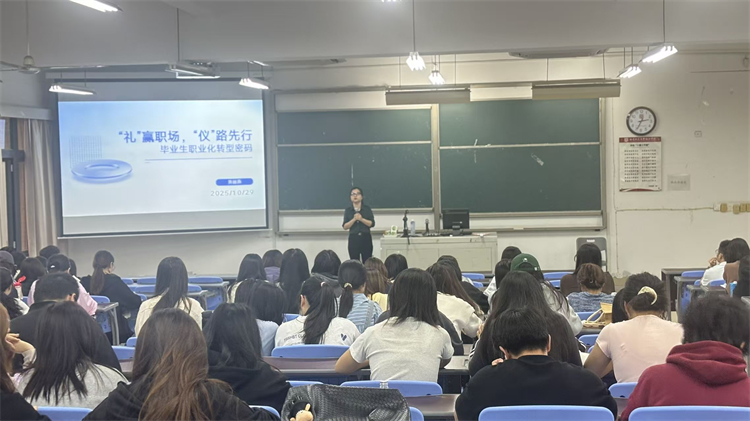学院管理学系教师黄丽燕开展的“‘礼’赢职场‘仪’路先行”商务礼仪专题培训备受青睐。课堂上,黄老师通过还原面试接待、商务洽谈等真实场景,系统讲授了职业形象塑造、商务礼仪规范等实用内容。现场,学生们纷纷上手练习礼仪姿势,在实操中掌握职场礼仪的要领、细节。