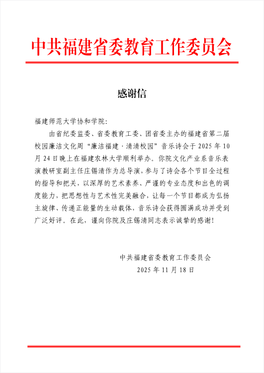 近日,中共福建省委教育工作委员会向福建师范大学协和学院发来感谢信,对学院在福建省第二届校园廉洁文化周“廉洁福建·清清校园”音乐诗会中的大力支持及学院文化产业系庄锡清老师出色工作表现给予高度肯定与诚挚感谢。