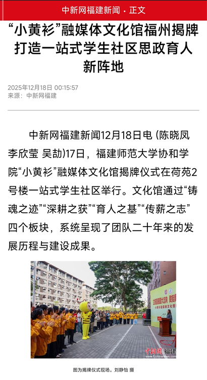 12月18日,中新网福建新闻报道福建师范大学协和学院“小黄衫”融媒体文化馆揭牌仪式在荷苑2号楼一站式学生社区举行。文化馆通过“铸魂之迹”“深耕之获”“育人之基”“传薪之志”四个板块,系统呈现了团队二十年来的发展历程与建设成果。