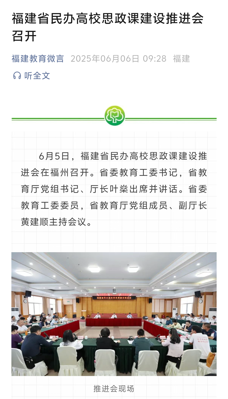 6月6日,福建教育微言报道建省民办高校思政课建设推进会在福州召开,福建师范大学协和学院等8家单位作交流发言。会议指出,要强化思想政治引领,统一思政课要求和标准,在更高起点上推动民办高校思政课高质量发展,不断开创立德树人新局面。