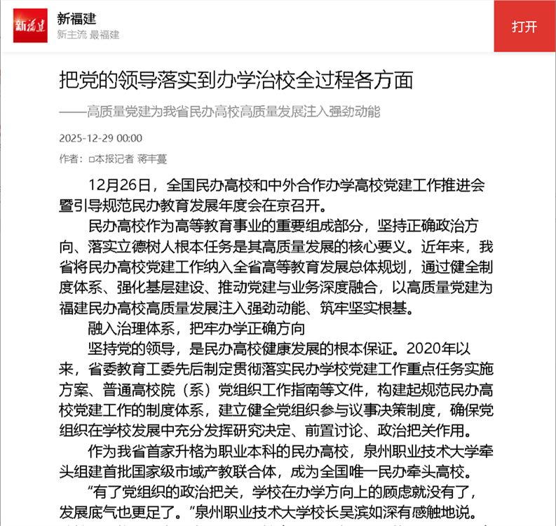 12月29日,新福建报道把党的领导落实到办学治校全过程各方面。近年来,我省将民办高校党建工作纳入全省高等教育发展总体规划,通过健全制度体系、强化基层建设、推动党建与业务深度融合,以高质量党建为福建民办高校高质量发展注入强劲动能、筑牢坚实根基。福建师范大学协和学院党委将党建势能转化为发展动能,与中国航天科工二院七〇六所合作,共建省内高校首个信创实验实训中心,聚焦国家战略需求培养人才,获省部级以上教学科研项目、优秀成果200余项,实现党建和事业发展同频共振、同步提升。
