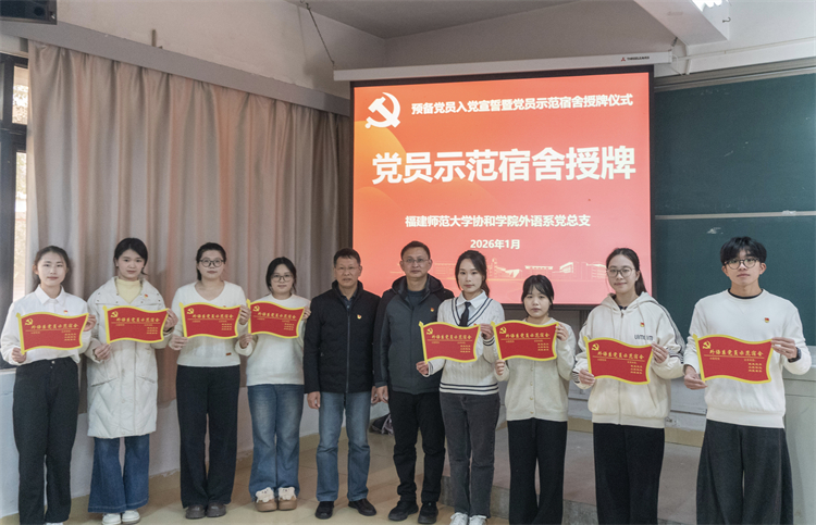 1月9日下午,福建师范大学协和学院外语系党总支在河西教学楼B2-103教室举行预备党员入党宣誓暨党员示范宿舍授牌仪式。外语系党政负责人、党总支委员、各党支部书记及新发展党员共同参加仪式。