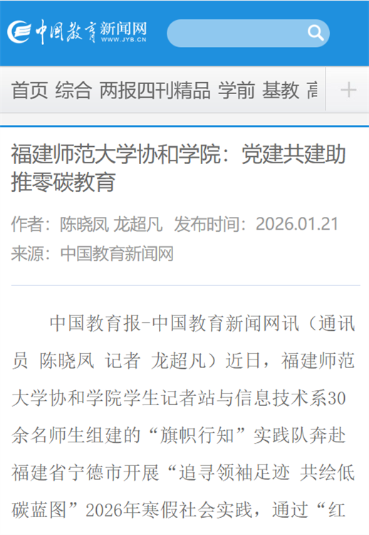 1月21日,中国教育新闻网报道福建师范大学协和学院学生记者站与信息技术系30余名师生组建的“旗帜行知”实践队奔赴福建省宁德市开展“追寻领袖足迹 共绘低碳蓝图”2026年寒假社会实践,通过“红色铸魂”与“绿色赋能”双线并行,以党建共建赋能零碳教育。