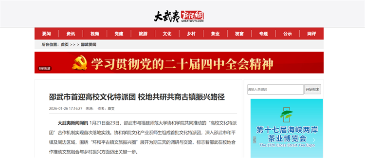 1月26日,大武夷新闻网报道福建师范大学协和学院文化产业系师生组成首批文化特派团,深入邵武市和平镇及周边区域,围绕“环和平古镇文旅振兴圈”展开为期三天的调研与交流。
