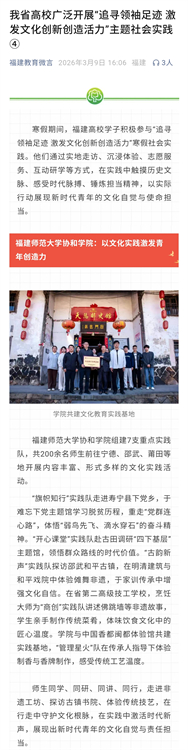 3月9日,福建教育微言报道福建师范大学协和学院组建7支重点实践队,共200余名师生前往宁德、邵武、莆田等地开展内容丰富、形式多样的文化实践活动。