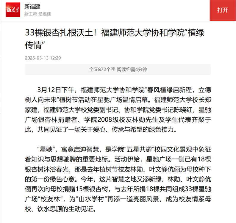 3月13日,新福建报道福建师范大学协和学院在星驰广场开展“春风植绿启新程,立德树人向未来”植树节活动。福建师范大学校长郑家建,福建师范大学校党委副书记、协和学院党委书记陈晓红,星驰广场银杏林捐赠者、学院2008级校友林勋先生及学生代表共同见证这场关于爱心、传承与希望的绿色接力。