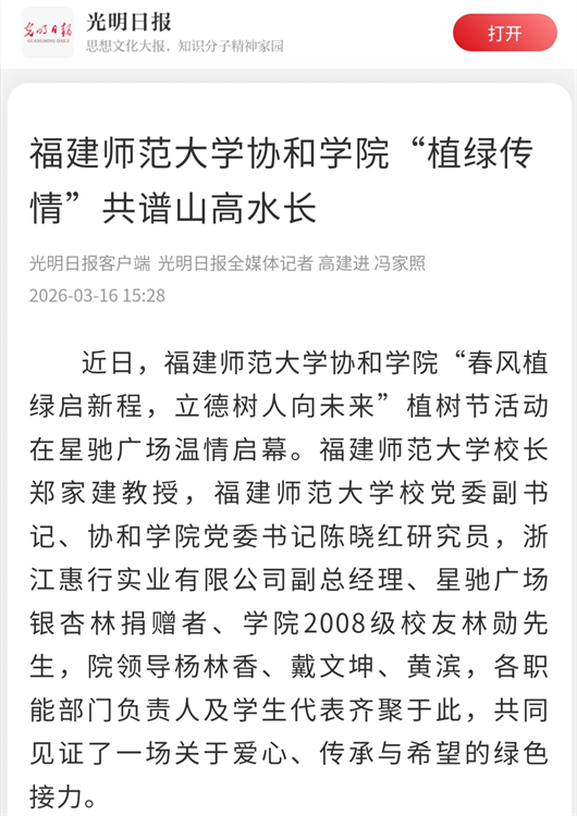 3月16日,光明日报客户端报道福建师范大学协和学院“春风植绿启新程,立德树人向未来”植树节活动在星驰广场温情启幕。