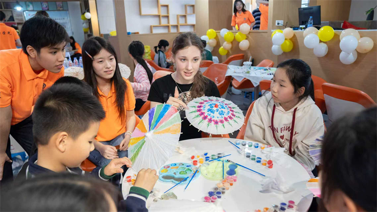 现场采用“大学生+小学生+留学生”混编分组的互动模式,不同学段、不同文化背景的学子们同堂互动、共学共乐。在双语互动环节,孩子们踊跃发言,现场气氛瞬间被点燃。随后的非遗体验中,软木画制作区的小学生们专注于将风干的满天星与各种形状的软木片嵌入透明钥匙扣盒;油纸伞彩绘区里,大学生指导孩子们在伞面上描绘山水花鸟,留学生们也沉浸于创作,在笔触与色彩中感受中华传统美学的意蕴。整个活动现场既洋溢着专注的气息,也充满了欢声笑语。