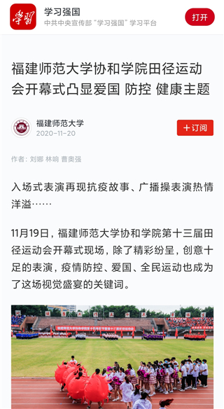 11月20日,学习强国报道福建师范大学协和学院田径运动会开幕式凸显爱国、防控、健康主题。