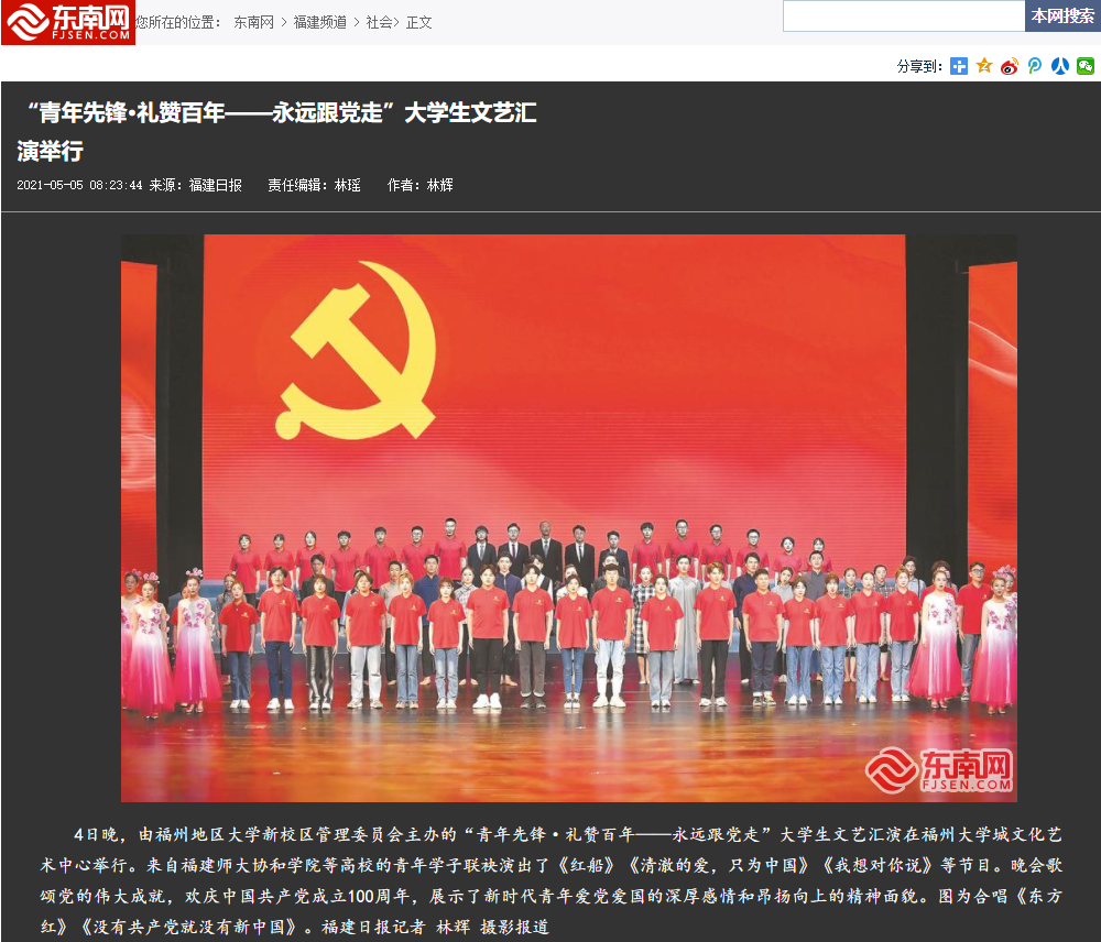 东南网4日晚,由福州地区大学新校区管理委员会主办的“青年先锋·礼赞百年——永远跟党走”大学生文艺汇演在福州大学城文化艺术中心举行。来自福建师大协和学院等高校的青年学子联袂演出了《红船》《清澈的爱,只为中国》《我想对你说》等节目。