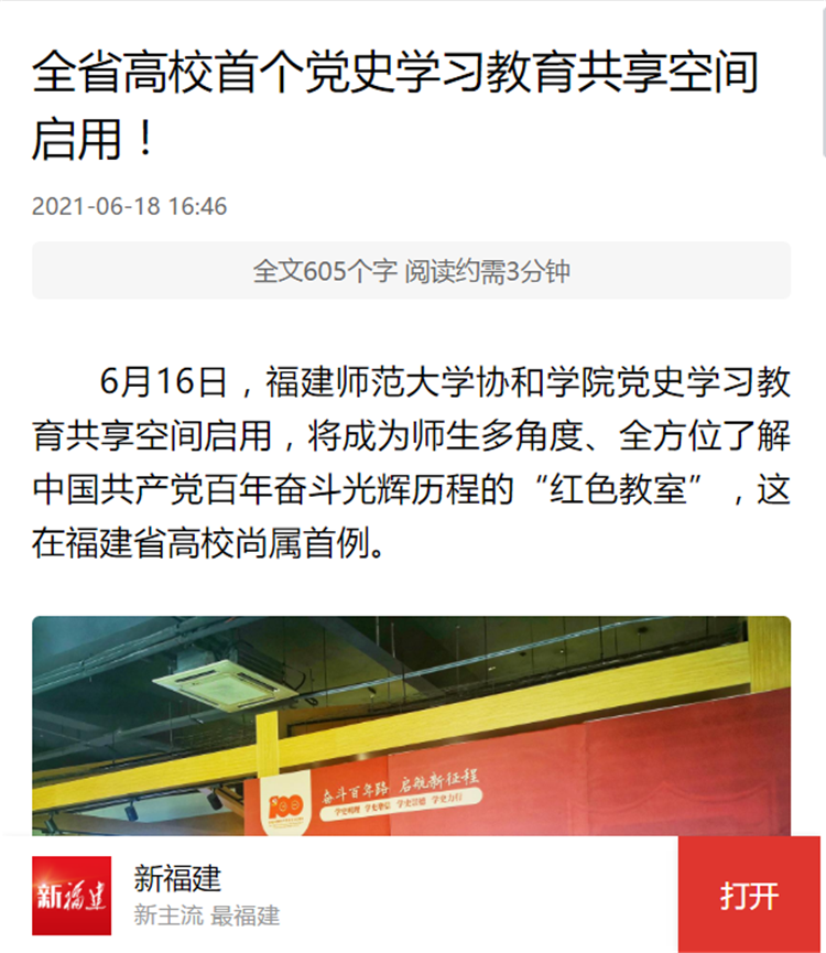 6月16日,《福建日报》—新福建报道福建师范大学协和学院党史学习教育共享空间启用,将成为师生多角度、全方位了解中国共产党百年奋斗光辉历程的“红色教室”,这在福建省高校尚属首例。